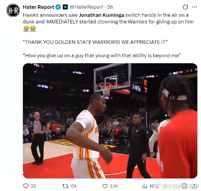 老鹰主场解说员在这场直播中嘲讽勇士队:感谢金州勇士队,我们深表感激,对于一个如此年轻且能力出众的年轻球员,你们竟然选择放弃,这简直让人难以理解。